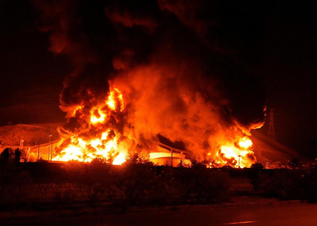 这是 6 月 15 日凌晨拍摄的伊朗首都德黑兰附近遭以色列袭击起火的储油设施。新华社 / 美联伊