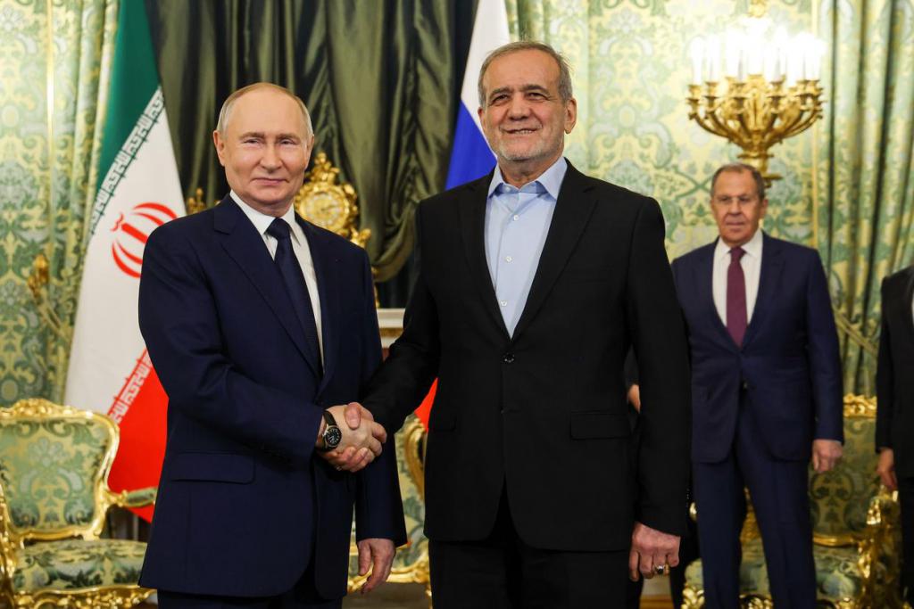 2025 年 1 月 17 日,俄罗斯总统普京(左)与到访的伊朗总统佩泽希齐扬在莫斯科举行会谈。新华社 / 塔斯社