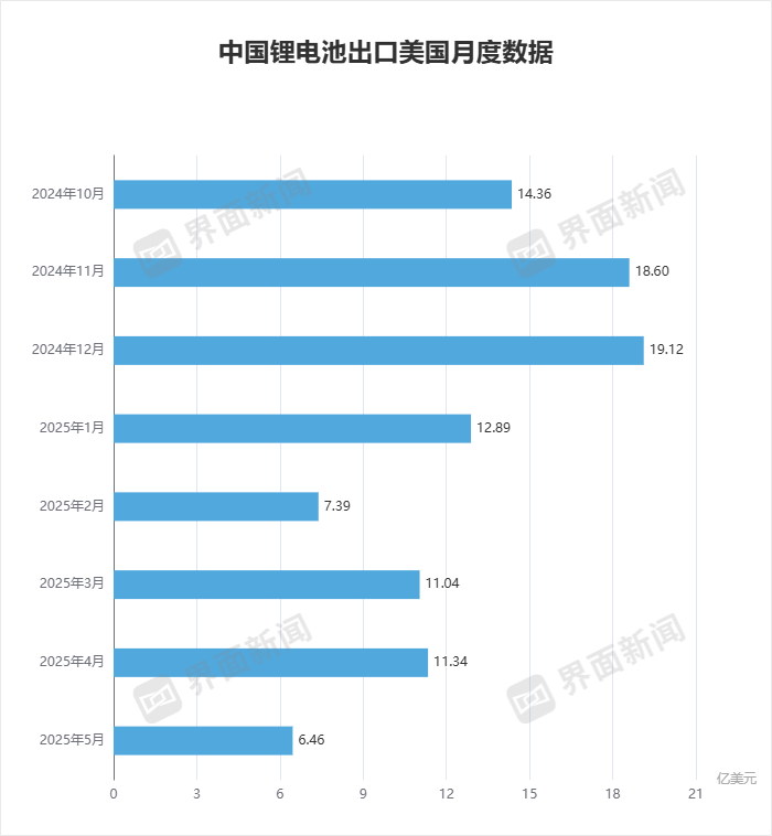 多位行业人士分析称,今年6月,中国出口到美国市场的锂电池金额可能会有进一步提高。