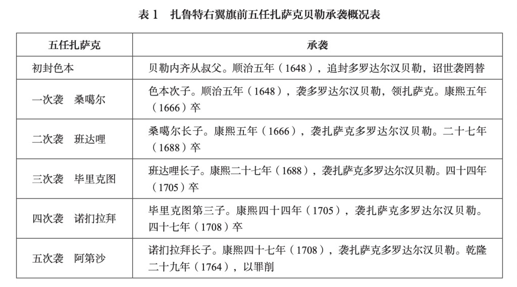 关于扎鲁特右翼旗前五任扎萨克承袭,《王公表传》记录如下。