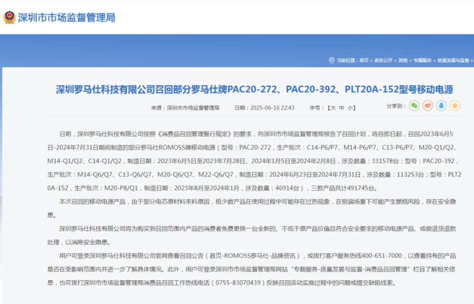 无独有偶,6 月 16 日晚上,深圳市市场监督管理局发布消息称,深圳罗马仕科技有限公司召回部分罗马仕牌 PAC20-272、PAC20-392、PLT20A-152 型号移动电源,三款产品共计 491745 件。