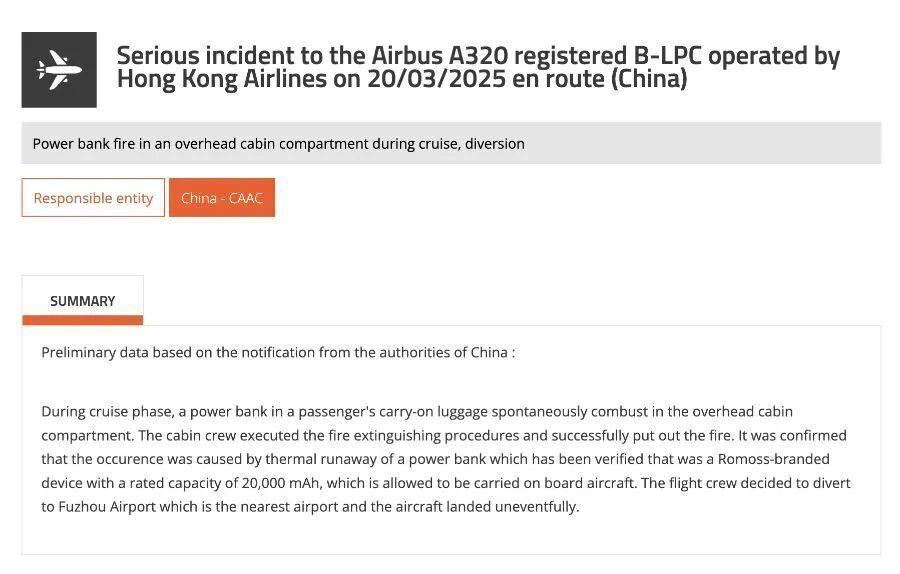 3 月 20 日,由杭州飞往香港的航班上,飞机头顶客舱内发生起火事件,随后飞机迫降。根据法国航空事故调查局初步调查,该事故是由充电宝的热失控引起的,该充电宝已被证实为罗马仕品牌的设备,额定容量也是 2 万毫安时。
