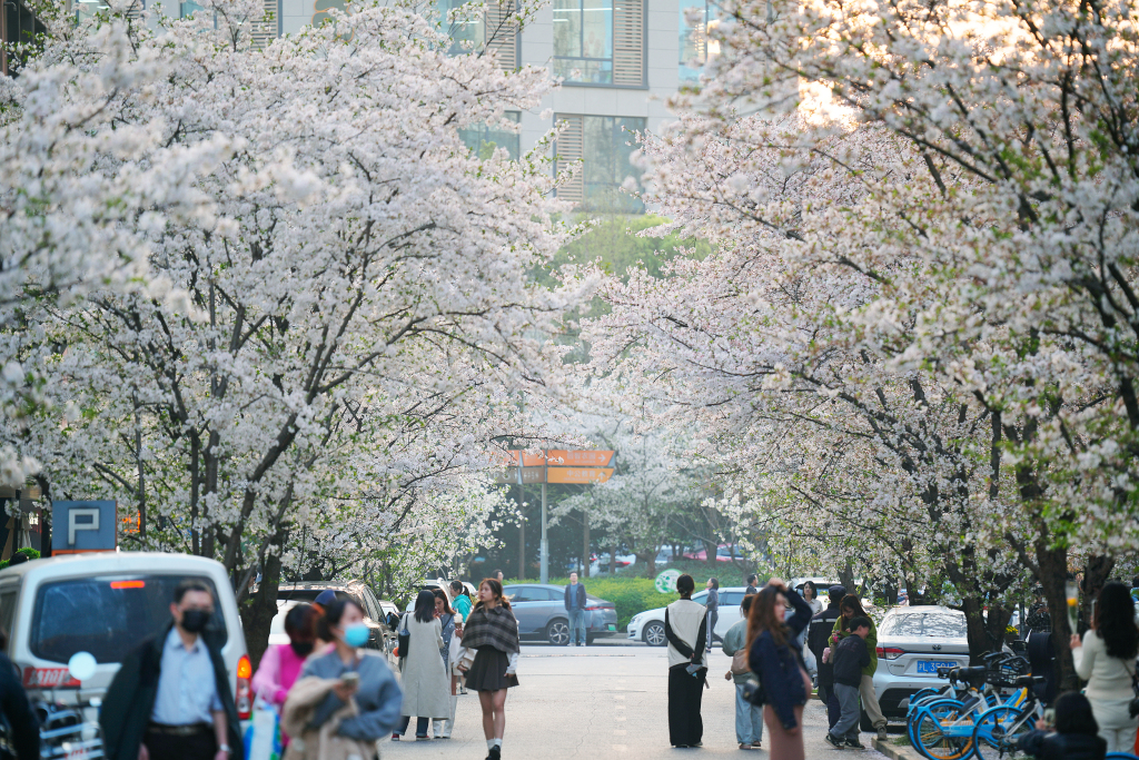 2024年3月31日,上海,杨浦区大学路开满了樱花,与周边的建筑和打卡人群融合在一起,美不胜收。视觉中国 图