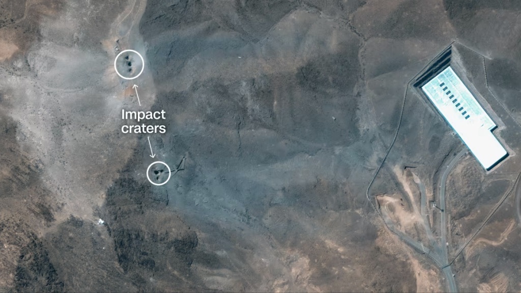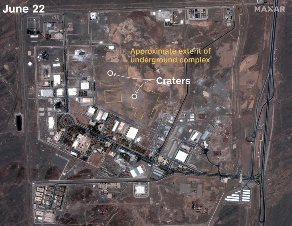 卫星图像显示,美国轰炸纳坦兹核设施后,该设施地下大厅上方出现两个弹坑。