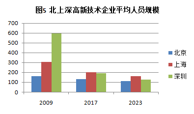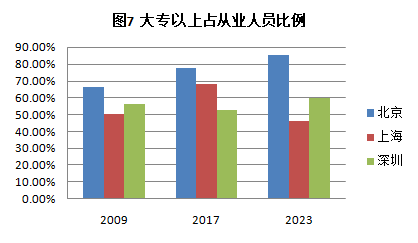 高企人才的学历角度,图7比较北上深三城高企中,大专以上学历人员在从业人员中的比例,发现北京高企在该比例上持续提高,深圳在2023年相较2009年略有提升,而上海2023年大专以上人员比例均低于2009、2017年。