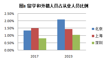 高企人才国际化角度,图8比较北上深三城高企中,留学归国人员和外籍常驻人员在从业人员中的比例,发现从2017到2023年,北京在高企人才国际化程度上进步最快,深圳次之,而上海略有下降。