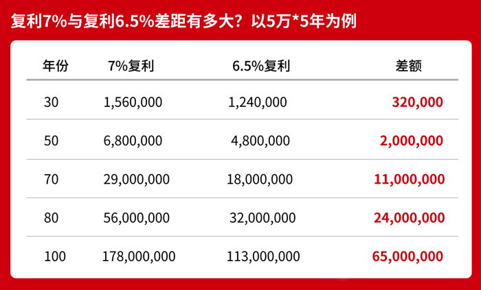 陈慧向界面新闻展示了一组数据,以年缴5万美元、5年总计25万美元的保单为例,持有30年,7%复利预期收益比6.5%高出32万美元;持有50年,差额扩大至148万美元;持有100年,差距高达6500万美元。