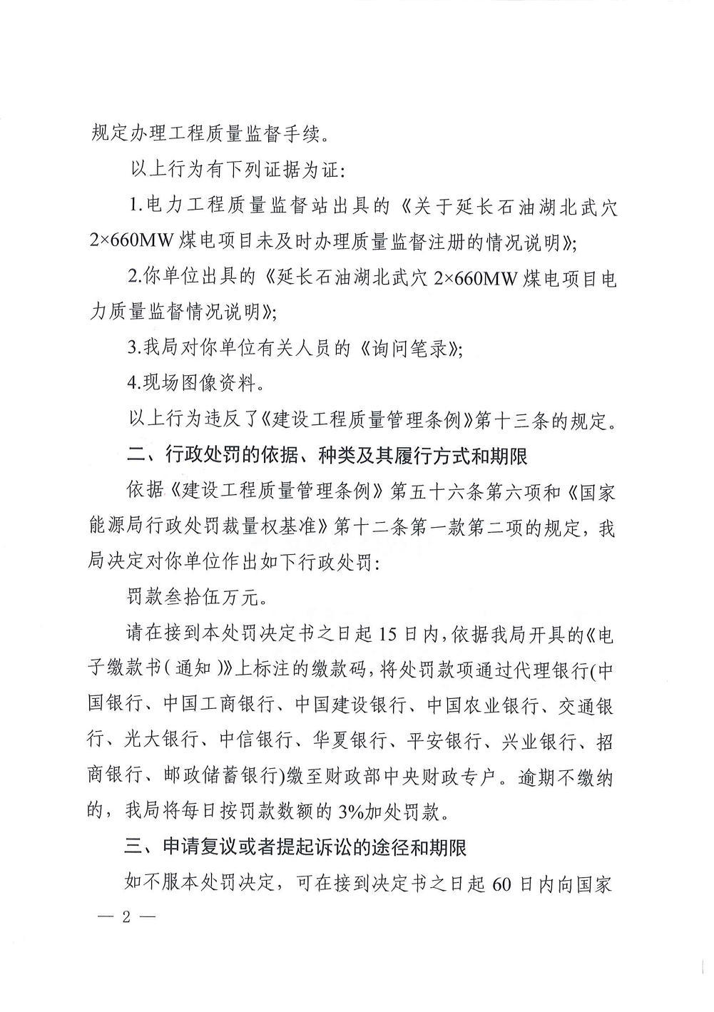 行政处罚书显示,根据电力工程质量监督站出具的《关于延长石油湖北武穴2×660MW煤电项目未及时办理质量监督注册的情况说明》、延长石油(湖北)发电有限公司出具的《延长石油湖北武穴2×660MW煤电项目电力质量监督情况说明》、国家能源局华中监管局对该单位有关人员的《询问笔录》,以及现场图像资料显示,该单位的行为违反了《建设工程质量管理条例》第十三条的规定。