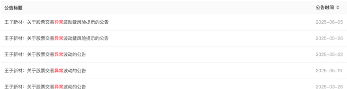 6月5日王子新材发布的异动暨风险提示公告,内容与5月26日雷同。