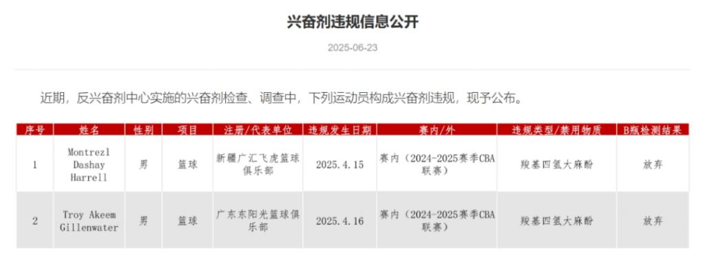 6 月 24 日,据 @中国篮球协会消息,中国篮协注意到中国反兴奋剂中心于 6 月 23 日发出的兴奋剂违规信息公开显示,在 2025 年 4 月由中篮联(北京)体育有限公司委托中国反兴奋剂中心进行的 CBA 联赛例行赛内兴奋剂检查中,CBA 联赛中的外籍球员 Montrezl Dashay Harrell 和 Troy Akeem Gillenwater 构成兴奋剂违规。