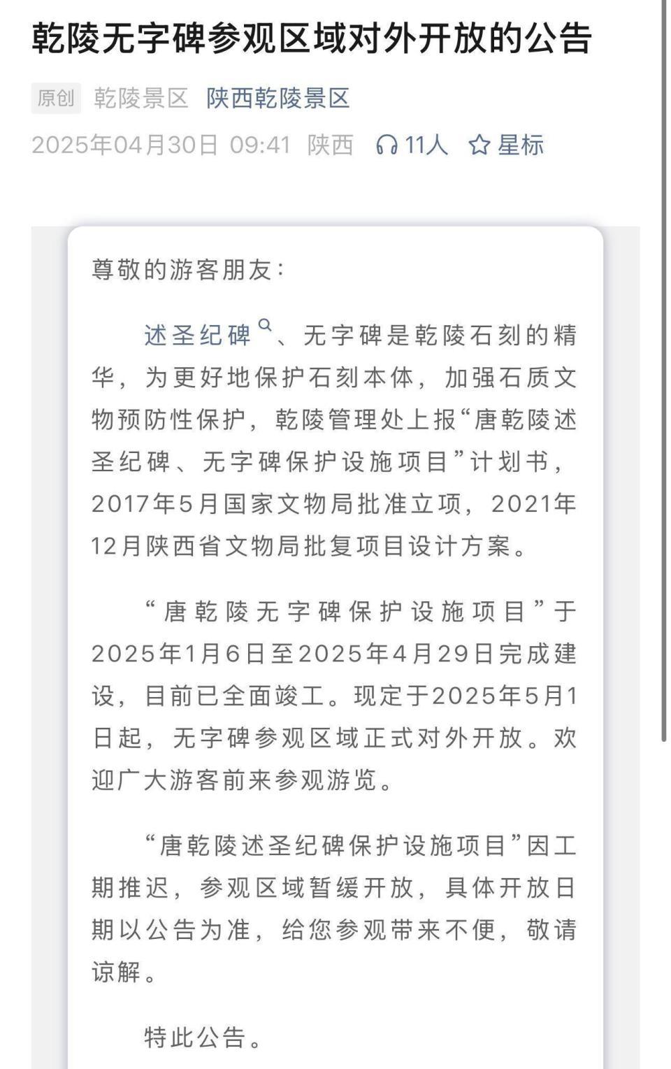据悉," 唐乾陵无字碑保护设施项目 " 于 2025 年 1 月 6 日至 2025 年 4 月 29 日完成建设,目前已全面竣工。无字碑参观区域已于 5 月 1 日起正式对外开放。" 唐乾陵述圣纪碑保护设施项目 " 因工期推迟,参观区域暂缓开放,具体开放日期还未公布。" 建造完成以后效果和目前无字碑参观区域差不多。" 工作人员说。