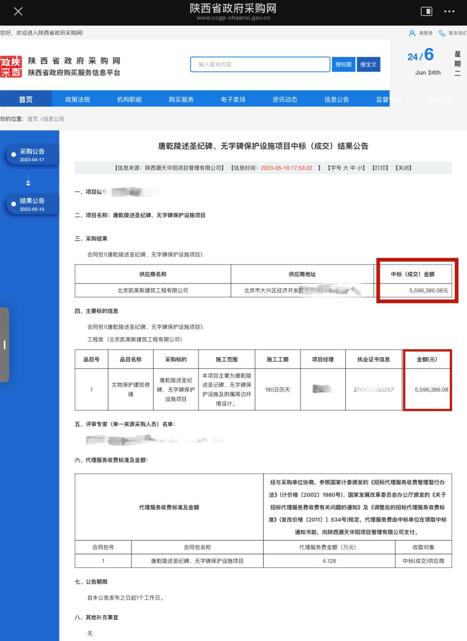 记者查询企查查和相关部门信息发现,该项目 2023 年 2 月 6 日由乾陵管理处发布政府采购意向,同年 5 月 10 日由北京凯莱斯建筑工程有限公司中标所得,中标金额 559.6 万余元,品目名称为文物保护建筑修缮,施工范围主要是唐乾陵述圣纪碑、无字碑保护设施及附属周边环境设计。
