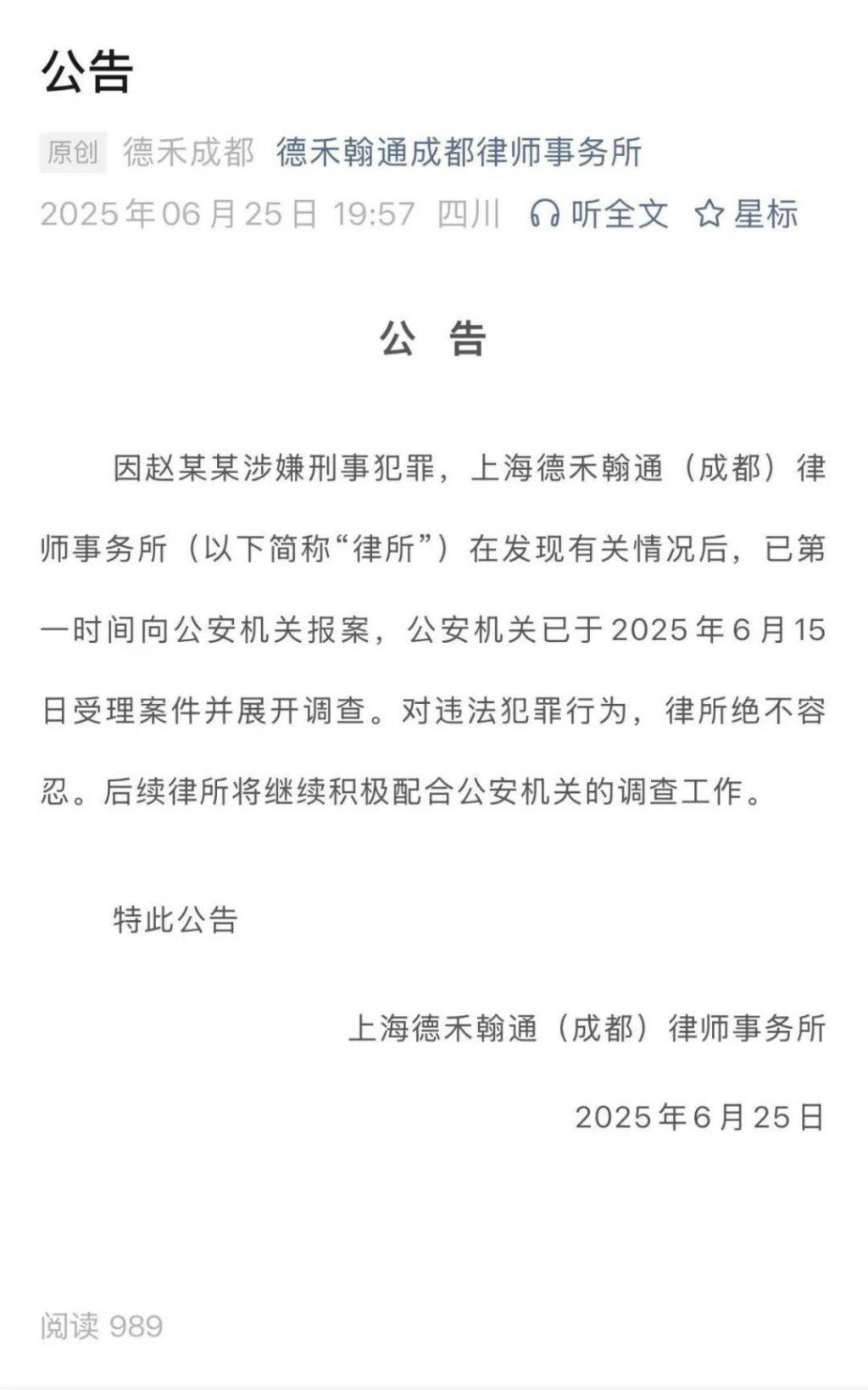 6 月 25 日,德禾翰通(成都)律师事务所发布公告,明确表示:在发现赵某某涉嫌刑事犯罪相关情况后,律所第一时间向公安机关报案。目前,公安机关已受理案件并展开调查。律所对违法犯罪行为零容忍,后续将全力配合公安机关调查工作。