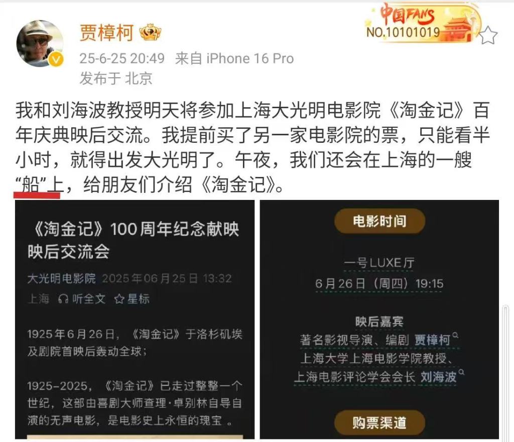 6月26日,适逢卓别林《淘金记》上映100周年,全球有500家影院选择在这天放映这部经典电影以示纪念。昨天晚上7点,上海影城放映了4K修复版《淘金记》,导演贾樟柯到场观看。但在该场放映结束后不久,有同场观众在网络上发文批评贾樟柯在影院内用手机摄屏。半夜,贾樟柯在微博发文,表示观影期间全程未拿出手机。