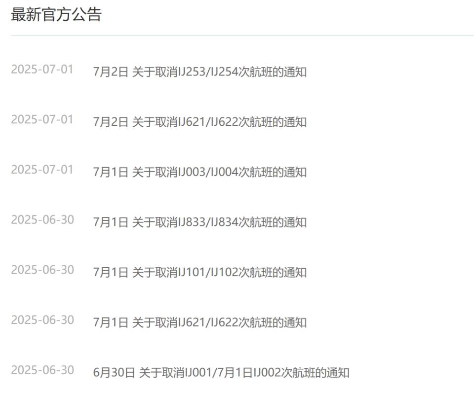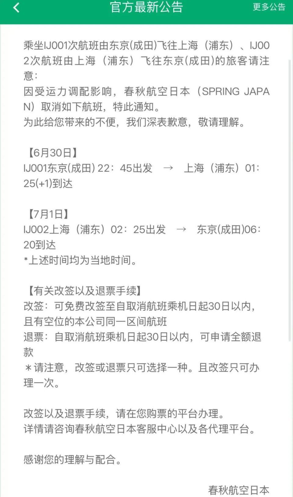 据春秋航空官网最新公告显示,7 月 1 日春秋航空日本多批次航班取消,包括 IJ001 次航班由东京(成田)飞往上海(浦东)、IJ002 次航班由上海(浦东)飞往东京(成田)等,取消原因均是 " 因受运力调配影响 "。