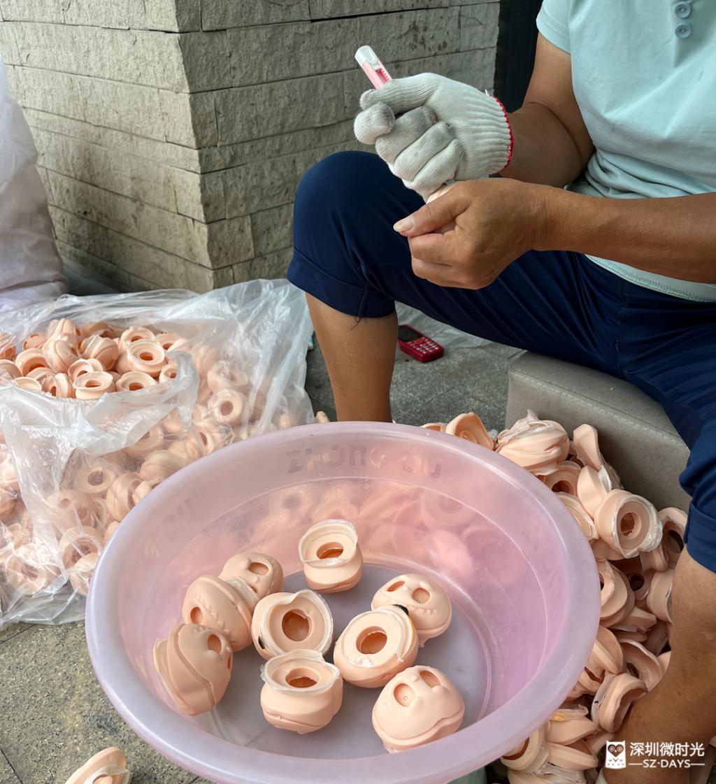 从模具里拿出来的搪胶脸,面孔与边角料之间有一道凹槽,胡梅玉要用工具刀,沿着凹槽将边角料削掉,削出的面部边缘要光滑且整齐。每天削下来的边角料,她要收进袋子,全部交还给 " 老板 "。有一次," 老板 " 在附近的废品站看到了搪胶产品的边角料,把胡梅玉与其他女工都敲打了一遍。