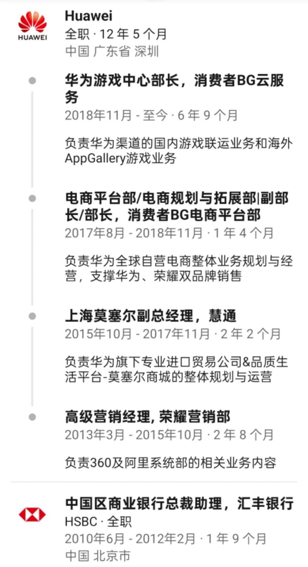 据领英显示,张 X 敏先后在汇丰银行、上海莫塞尔、华为任职,并曾任华为游戏中心部长。据多名接近张 X 敏的人士称,2021 年初她加入了 B 站,负责联运业务,花名「小姐姐」。而关于网传的入职腾讯,据求证,张 X 敏在职时间仅为几天。