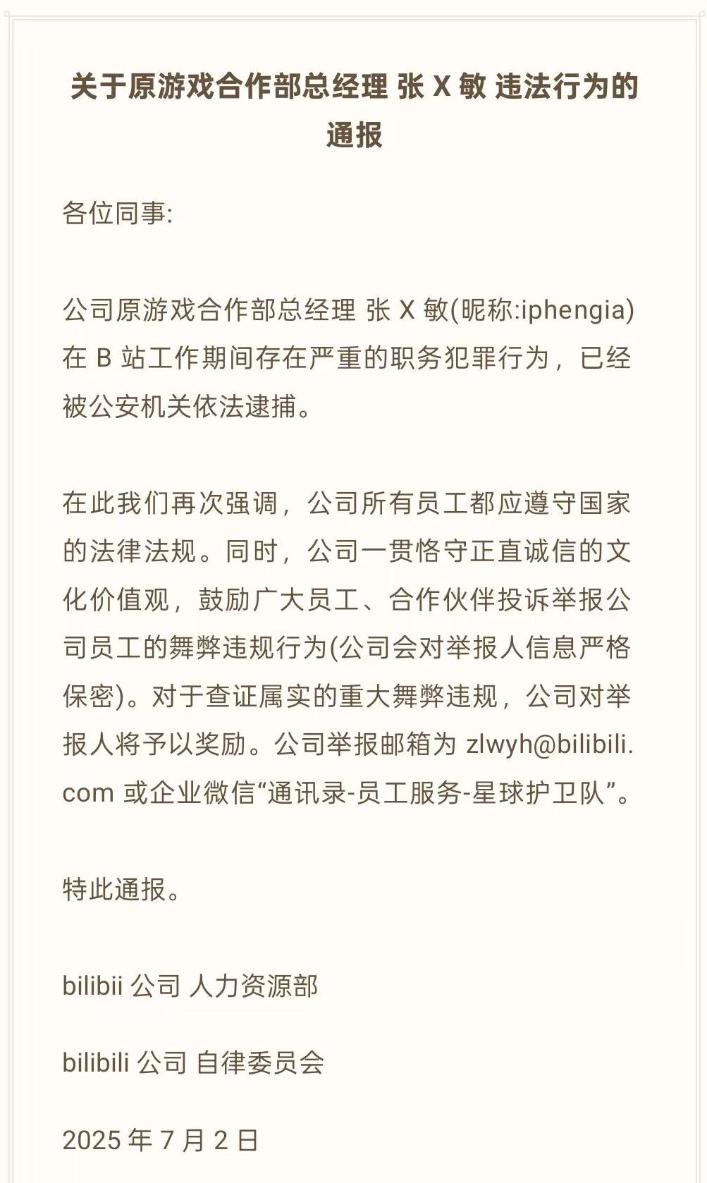 7 月 2 日下午 2 点,B 站向全体正式员工发送邮件,通报了原游戏合作部总经理张 X 敏的违法行为,称其在 B 站工作期间存在严重的职务犯罪行为,并表示其已经被公安机关依法逮捕。