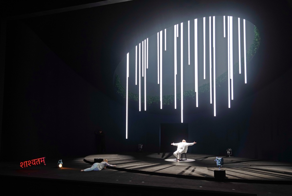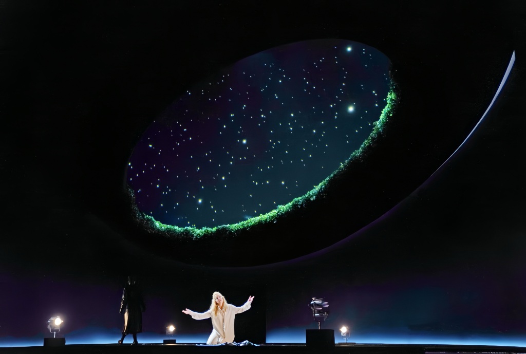 这一版《特里斯坦与伊索尔德》问世于2022年,由罗兰·施瓦布导演,在尊重原作的基础上,融入简约舞美和投影技术,将这出关于爱与死亡的戏剧,置于简朴的未来主义背景之下。