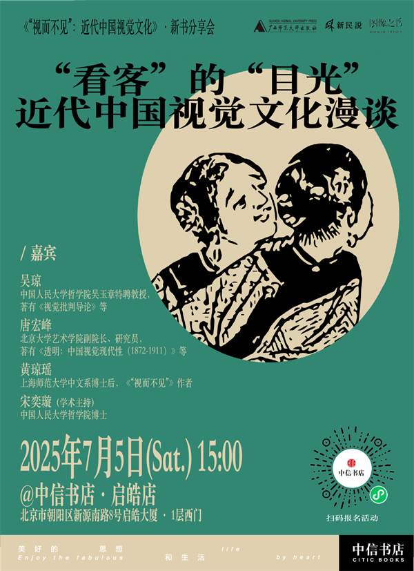 在各类图像让人目不暇接的今天,我们为什么还要重新走进近现代中国的视觉世界?本次分享会将带领大家回到晚清图像时代兴起之初,跟随街头巷尾“看客”的目光,站在观看者的位置,感受当时人们在看什么、怎样看、什么决定了这种看、这种看又如何被图像所捕捉。7月5日,我们邀请大家和中国视觉文化研究领域代表性学者吴琼教授、唐宏峰教授,与《“视而不见”》的作者黄琼瑶博士一起走进视觉文化研究的前世今生。