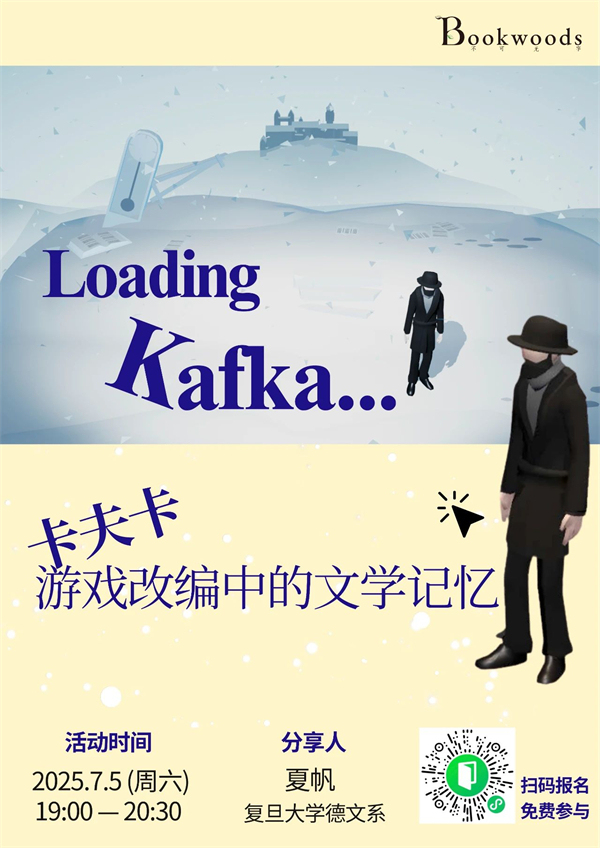 2024年,时值卡夫卡逝世一百周年,歌德学院和 Charles Games 游戏工作室共同推出了剧情冒险游戏《玩转卡夫卡》(Playing Kafka),重构了卡夫卡的经典文本《审判》《致父亲的信》和《城堡》。游戏将荒诞的叙事风格融入游戏设计,邀请玩家在人物操纵、话语选择和场景转换中共同完成叙事和对卡夫卡的致敬,共创卡夫卡的当代文学记忆。7月5日,Bookwoods特邀夏帆做客书店,带大家走进卡夫卡的文本《城堡》以及游戏《玩转卡夫卡》的第三幕《城堡》,漫谈文学如何在游戏中重生:卡夫卡式空间如何变成游戏地图?玩家如何在“无意义的选择”中体验叙事的张力?文字如何在互动中生成记忆的残响?作为读者、玩家、研究者,我们如何重新进入卡夫卡?