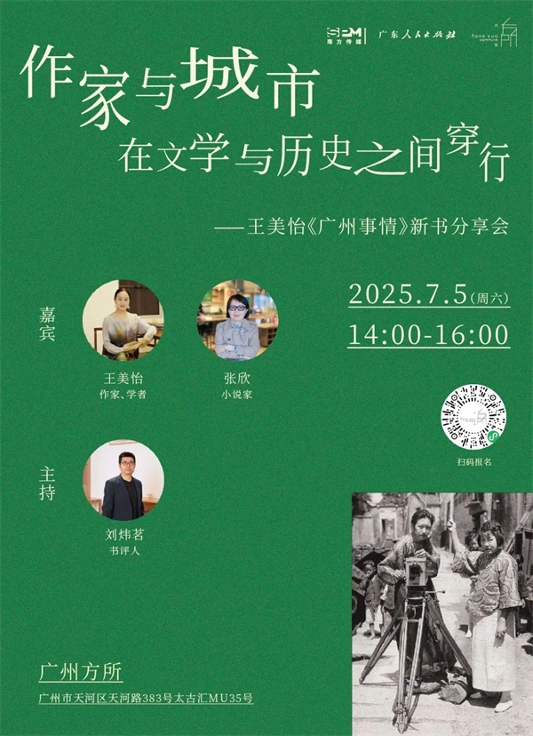 一座城市的记忆,如何在文字中重生?当严谨的历史考据遇上灵动的文学笔触,会碰撞出怎样的火花?7月5日,知名作家、广州市社会科学院广州历史文化研究中心主任王美怡将携新书《广州事情》做客广州方所。本次活动特邀著名作家张欣作为嘉宾,她的长篇小说新作《如风似璧》首次涉及广州民国史题材,书写三位女性在动荡时代中的生活与抗争。两位写作风格迥然不同的女性写作者同时把目光投射到广州这座静水流深的南方城市中。她们将从各自不同的写作经验出发,从不同角度探讨:如何用文字讲述一座城市隐藏在历史深处的故事?历史研究如何滋养文学创作?文学又如何让历史“活”起来?
