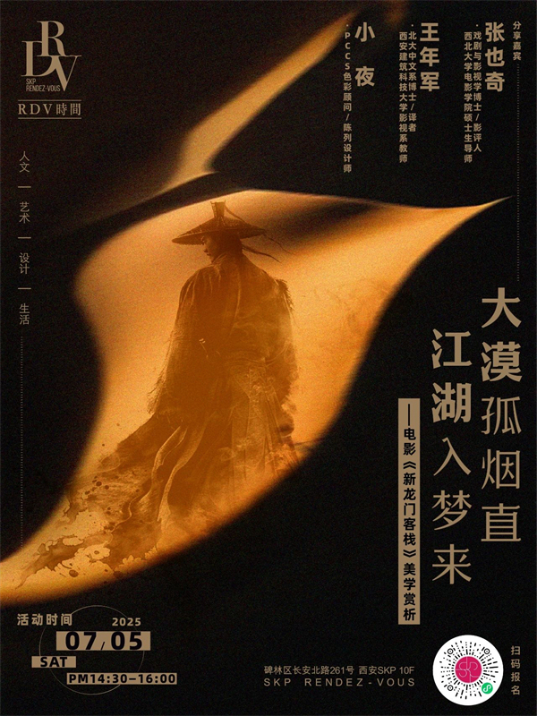 7月5日下午,我们特别邀请西北大学电影学院硕士生导师张也奇、西安建筑科技大学影视系教师王年军、色彩设计师小夜,做客SKP,从武侠电影的颠覆性转型、儒侠精神与乱世情深以及电影中的隐喻和符号化表达等多重角度,与大家深入探讨《新龙门客栈》的艺术魅力和文化价值。