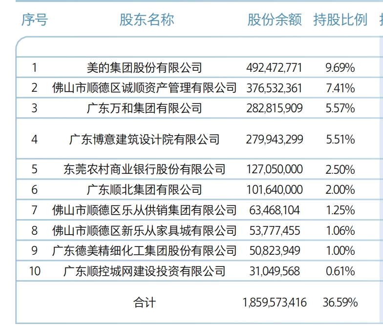 年报披露,截至2024年末,顺德农商银行的前三大股东为:美的集团股份有限公司(持股比例9.69%)、佛山市顺德区诚顺资产管理有限公司(持股比例7.41%)、广东万和集团有限公司(持股比例5.57%)、广东博意建筑设计院有限公司(持股比例5.51%)、东莞农村商业银行股份有限公司(持股比例2.5%)。