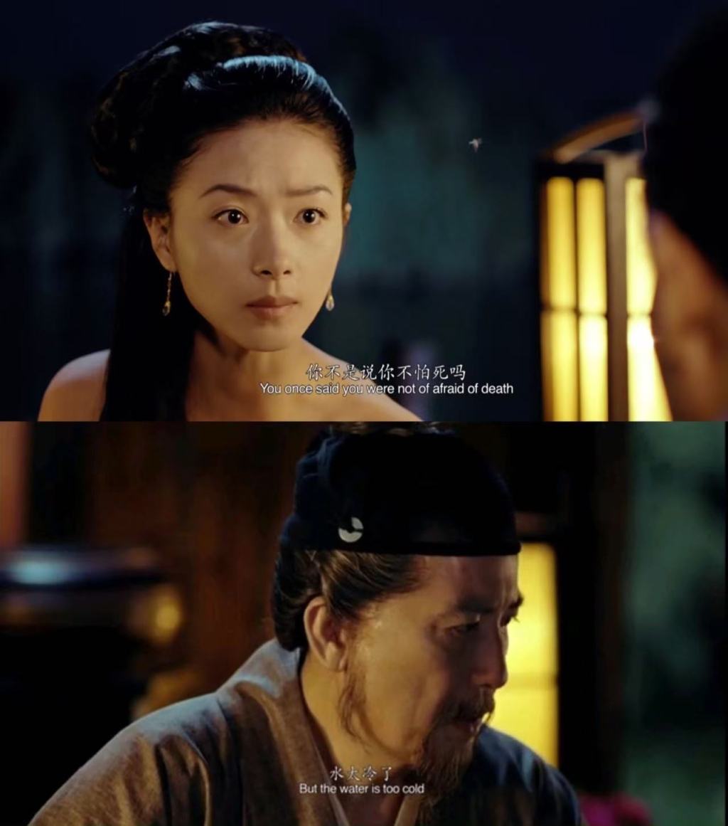 “水太凉”说的是钱谦益原本要投湖殉国,结果以“水太凉”为借口不跳了。图为电影《柳如是》(2012)对这一情节的演绎。