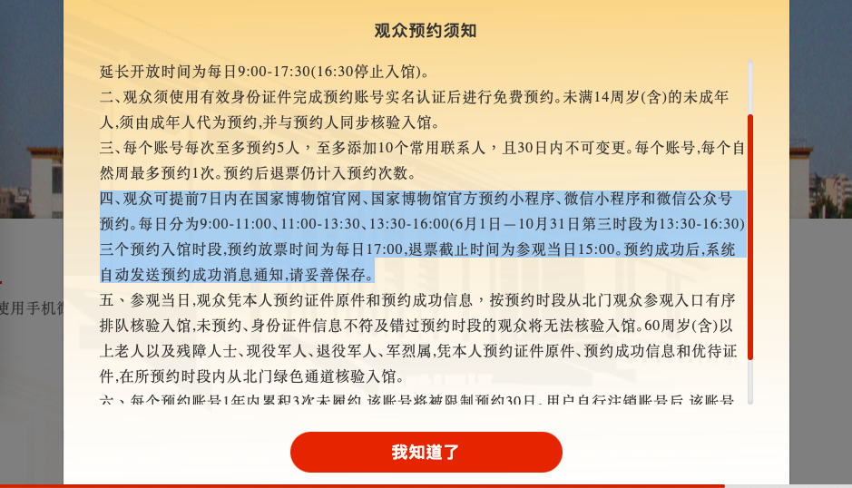 澎湃新闻记者登录国家博物馆的官网可以看到条分缕析的“观众预约须知”,其中,最为重要的说明是“预约入馆时段,预约放票时间为每日17:00,退票截止时间为参观当日15:00。”这意味着,在火热的暑假时段,观众需要在预计参观日提前七天的17:00卡点刷新网站,才有可能预约到门票。