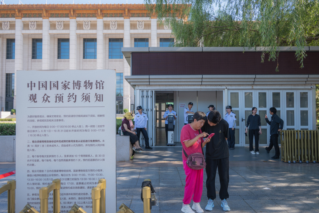 澎湃新闻在现场看到,国家博物馆并未设当天临时预约窗口,如果想进国博,只能提前预约。一对母女坐在保安亭附近的树荫里休息,地上铺了一块格纹布,一袋零食撒在上面。这对母女前一天晚上顺利预约了天安门的入场,但是国博门票则显示约罄,于是没有安排相关行程。“我们听说过要预约,但是没想到要提前那么久预约,还以为提前一两天就可以。”这就意味着,对不少在北京待不到7天的游客来说,得在到达北京之前就约好门票。