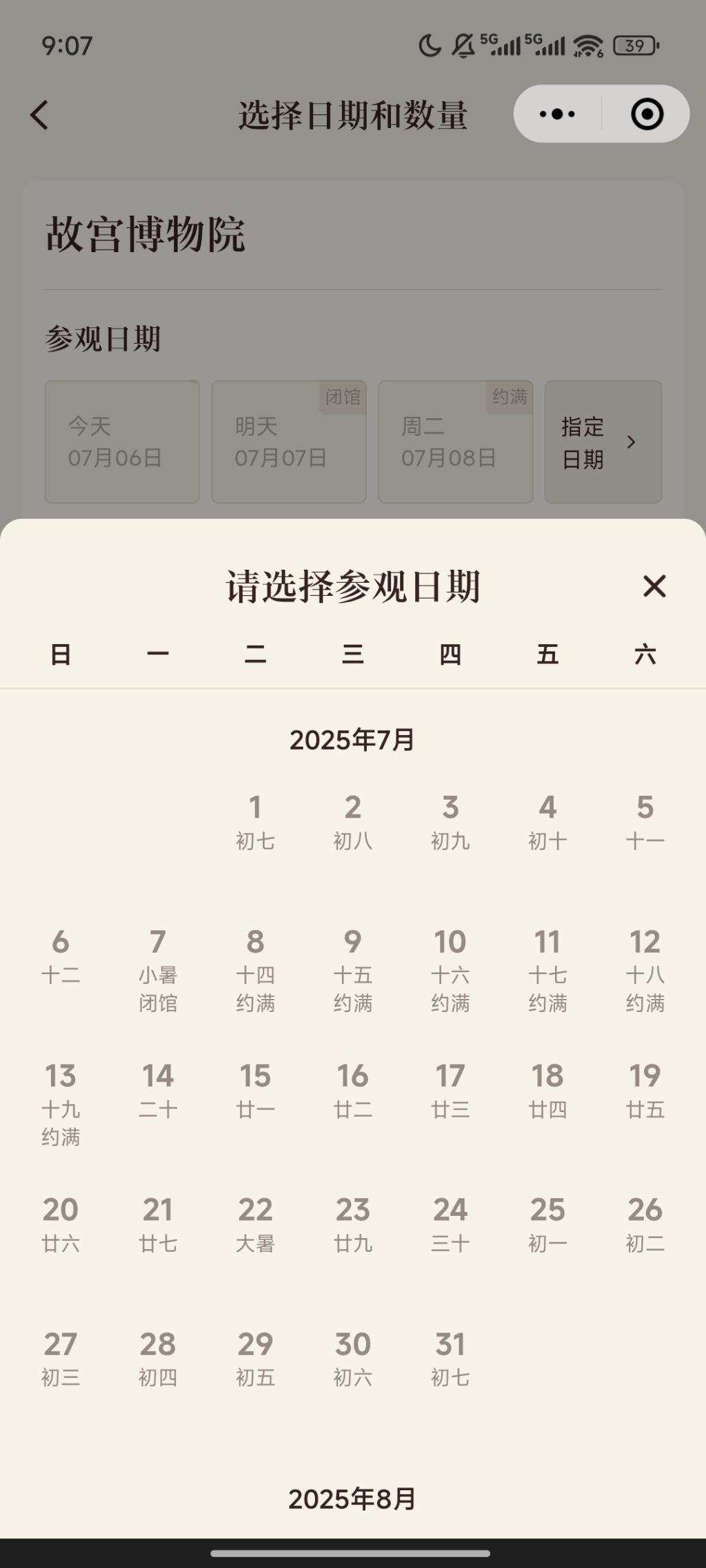故宫博物院和国家博物馆的情况相仿,也实行预约参观制,需要提前通过故宫博物院网络售票网站或微信故宫博物院观众服务号实名预约门票,打开“故宫博物院观众服务号”会发现,未来七天的门票也均已售罄,观众需要在参观日前七天的晚8点提前购票。