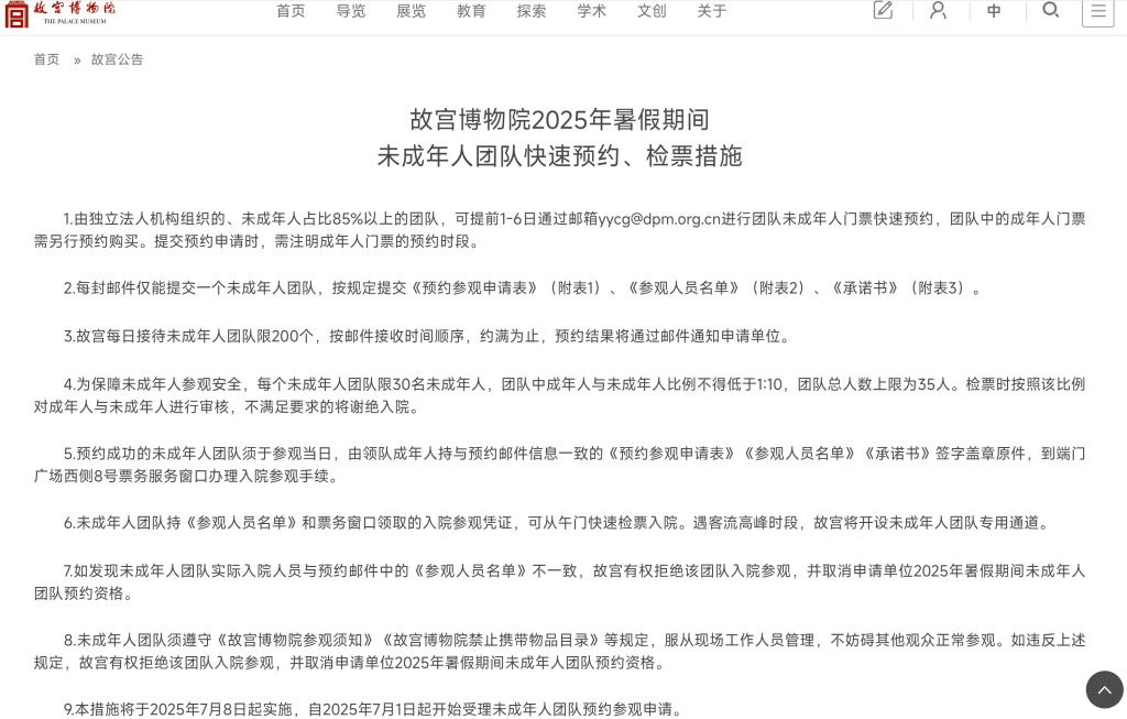 澎湃新闻记者在故宫博物院官网看到,故宫博物院于6月30日发布了一则最新通知——《故宫博物院2025年暑假期间未成年人团队快速预约、检票措施》,其中显示:“由独立法人机构组织的、未成年人占比85%以上的团队,可提前1-6日通过邮箱yycg@dpm.org.cn进行团队未成年人门票快速预约。”
