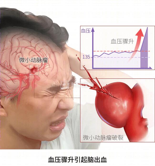 大脑内的小血管硬化,在长期高血压的影响下,血管壁变得像玻璃一样脆,而且越来越薄。一旦血压突然升高(比如酗酒、生气、熬夜工作等),就容易破裂,进而导致脑出血。