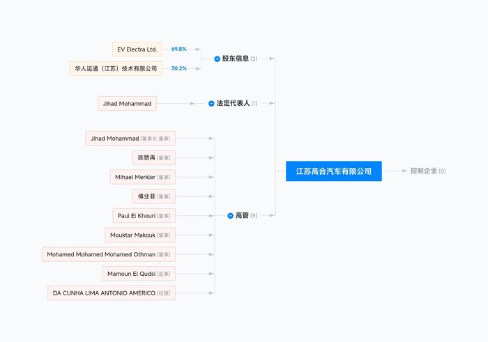2025年5月22日,江苏高合汽车有限公司成立,法定代表人为Jihad Mohammad,注册资本约1.43亿美元,经营范围包括道路机动车辆生产、汽车零部件研发、工程和技术研究和试验发展等,由EV Electra Ltd.和华人运通(江苏)技术有限公司共同持股。持股比例分别为69.8%和30.2%,前者出资1亿美元,认缴出资日期为2025年12月31日。