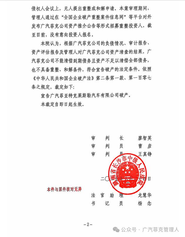 财联社 7 月 8 日讯,今日,据 " 广汽菲克管理人 " 微信公号发布消息称,因广汽菲克公司已无重整可能,根据部分债权人意见,经债权人委员会讨论,管理人已经申请长沙中院裁定宣告广汽菲克公司破产。长沙中院召开的第一次债权人会议上,管理人拟订的《破产财产分配方案》已经获得债权人会议表决通过。经管理人申请,2025 年 6 月 27 日,长沙中院已经裁定认可。管理人将依法依规,抓紧推进本案各项收尾工作,维护广大债权人合法权益,争取早日按《破产财产分配方案》完成破产财产分配工作。