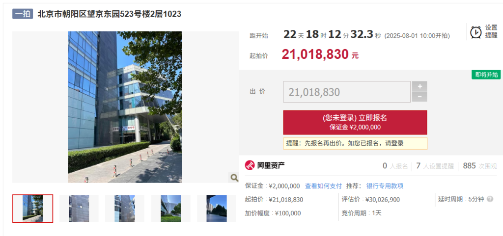 阿里资产拍卖网披露的信息显示,此次拍卖的标的物为北京市朝阳区望京东园523号楼2层1021和北京市朝阳区望京东园523号楼2层1023。其中,1021室起拍价约2101.8万元,1023室起拍价约1868.9万元,均是评估价的七折,8月1日开始竞价。目前均无人报名。