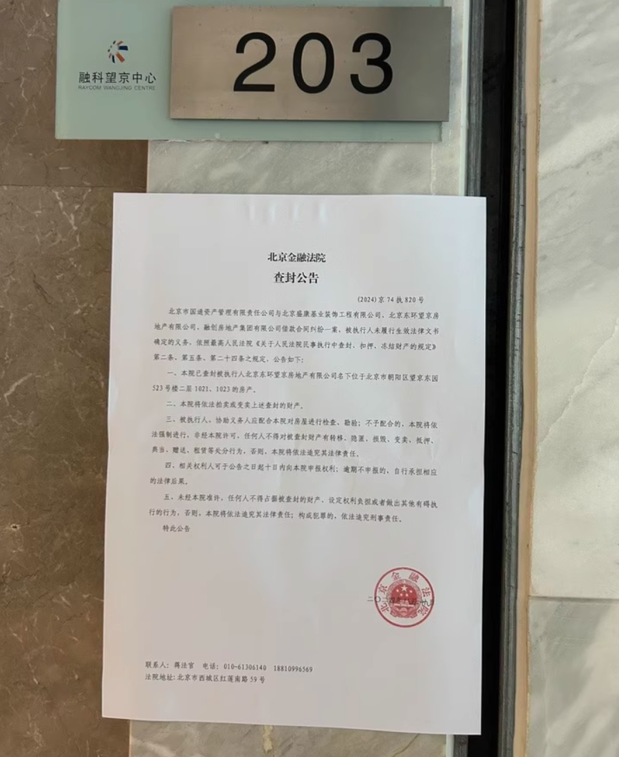 在阿里资产的拍卖公告中,这两间办公物业门口张贴的北京金融法院的查封公告【(2024)京执820号】显示:北京市国通资产管理有限责任公司与北京盛康基业装饰工程有限公司、北京东环望京房地产有限公司、融创房地产集团有限公司借款合同纠纷一案,被执行人未履行生效法律文书确定的义务。本院已查封被执行人北京东环望京房地产有限公司名下位于北京市朝阳区望京东园523号楼二层1021、1023的房产。本院将依法拍卖、变卖上述查封的财产。