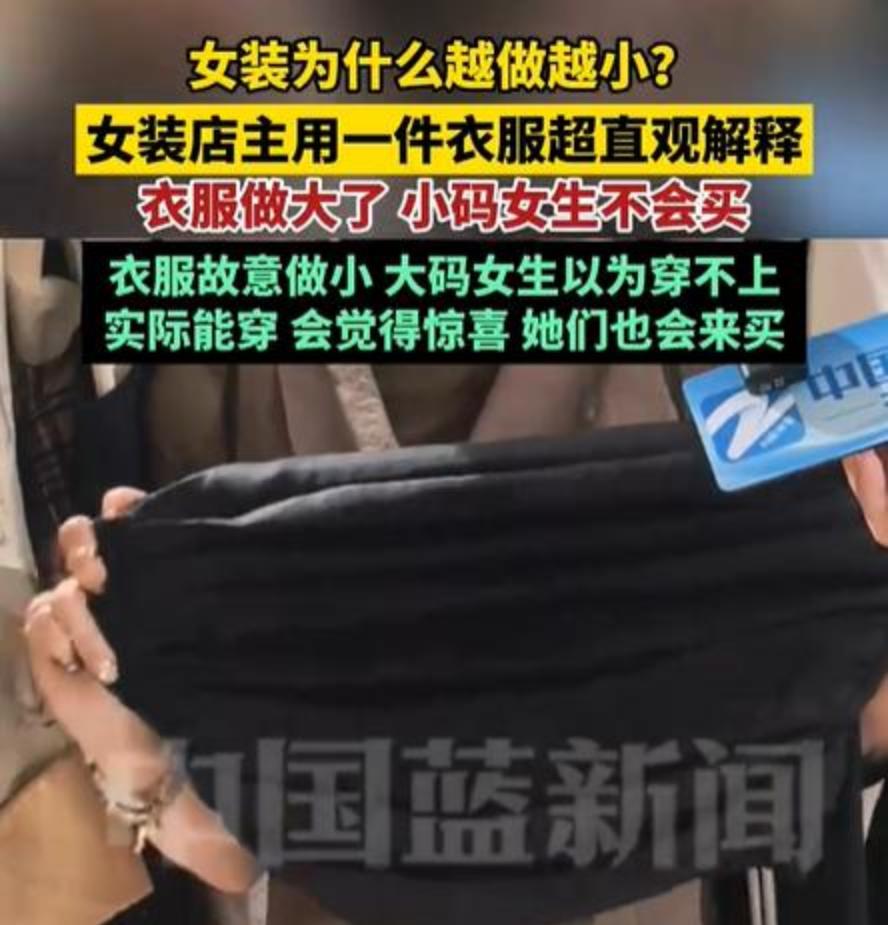4月14日,话题#店主解释为何女装越做越小#冲上全国热搜第一,该店主称,“衣服做大了,小码女生不会买;而衣服故意做小,大码女生以为穿不上但实际能穿,就会有惊喜感,反倒能促进购买。”