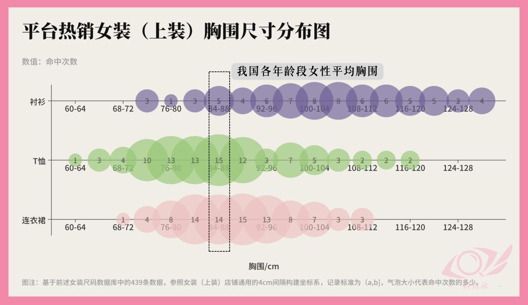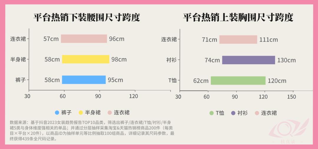 为了探究当下女装行业的尺码情况,核真录调研了淘宝和天猫两个平台的女装热销榜商品,获取代表性数据439条。可以看到,下装类服饰的腰围跨度较为平均,基本都在57cm-98cm内;而上装类服饰受到款式的影响,衬衫的胸围跨度更为包容,连衣裙的胸围跨度最小。