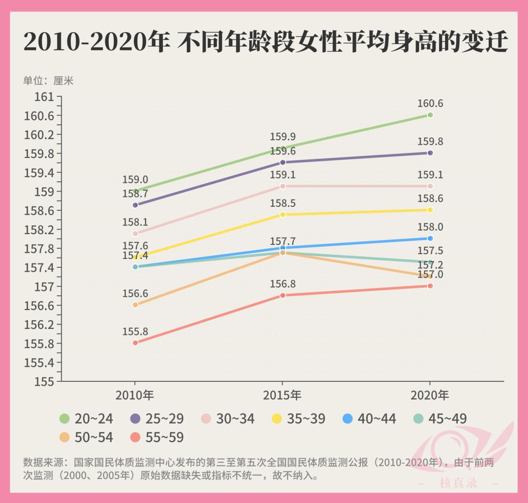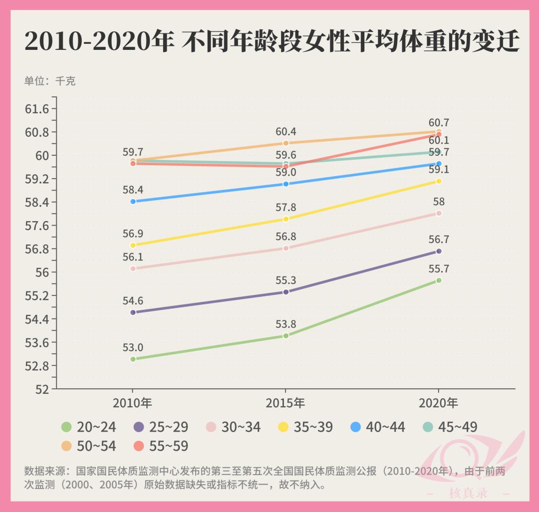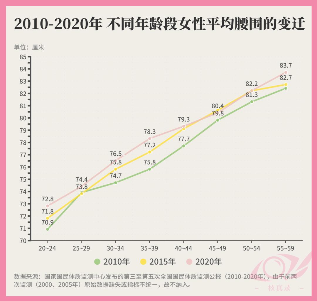 从国家国民体质监测中心发布的第三至第五次全国国民体质监测公报(2010-2020年)中可以看到,10年间,中国20至59岁女性的平均身高、体重和腰围均呈现持续上升趋势。