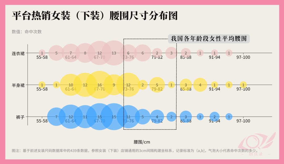 从平台热销女装腰围尺寸分布图中我们可以看到,当下女装的腰围尺寸要远“落后”于女性实际腰围尺寸 。当单一的“完美身材”不再具有统治力,现代女性日益拥抱健康多元的身材曲线时,女装尺码的“逆向生长”趋势亟需改变。