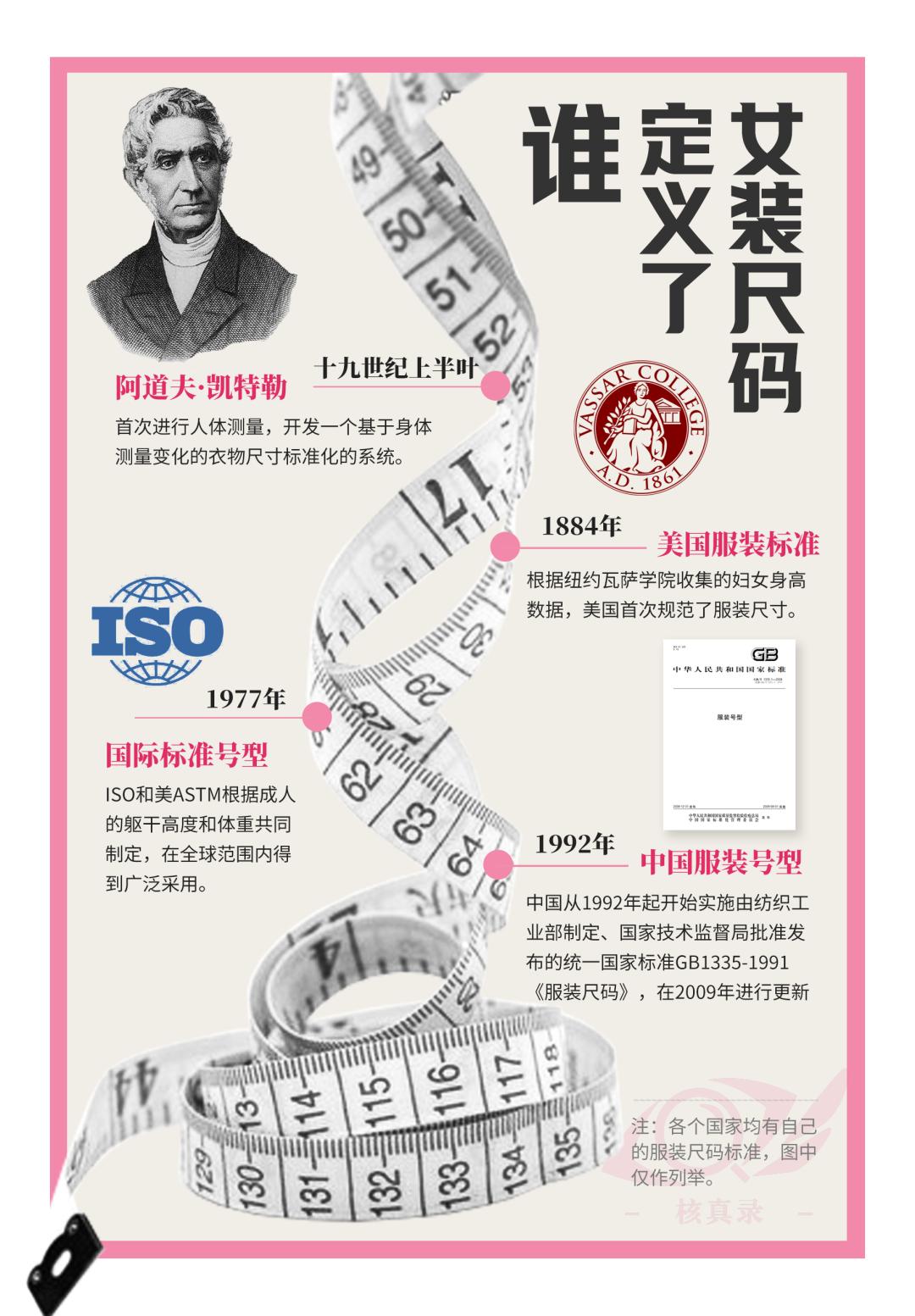 是谁规范了女装尺码?女装尺码为何越来越小?我们先从历史的视角,回溯到十九世纪上半叶,比利时数学家阿道夫·凯特勒(Adolphe Quetelet)首次进行人体测量,开发一个基于身体测量变化的衣物尺寸标准化的系统;到1884年,根据纽约瓦萨学院收集的妇女身高数据,美国首次规范了服装尺寸,此后中国、欧洲相继在推出适合本国、本地区的服装标准。