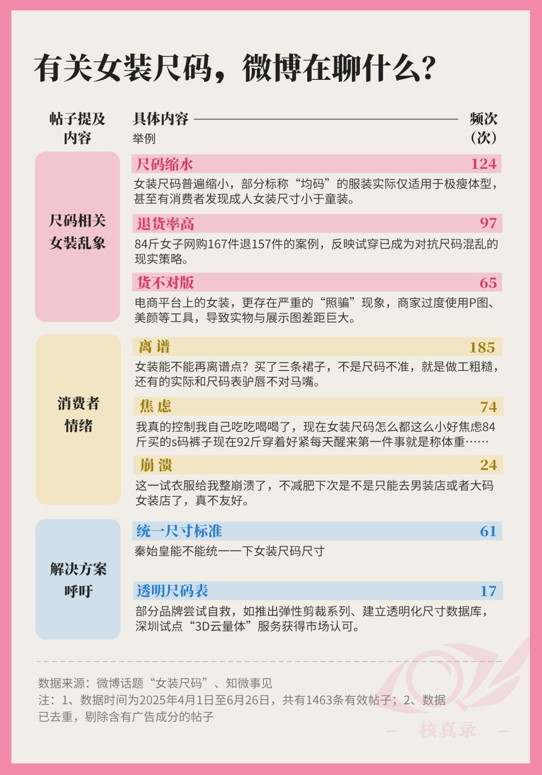 有关女装尺码,大家都在聊什么?核真录爬梳了微博数据,可以看到 “消费者苦女装乱象久矣”。