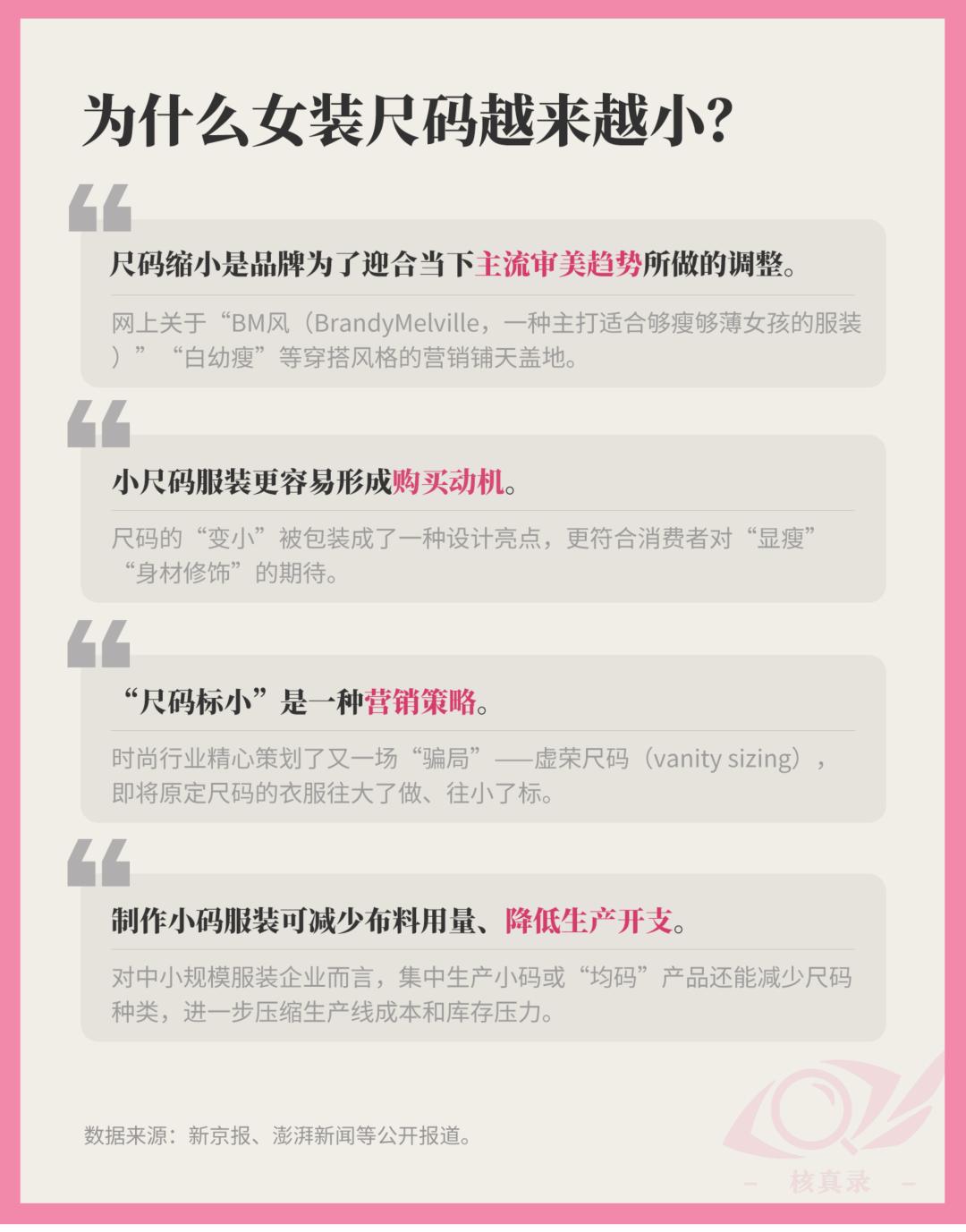 但尺码标准不统一只是解释之一。更多观点指出,女装尺码缩小的背后还藏着社会审美的变迁与明确的成本考量。