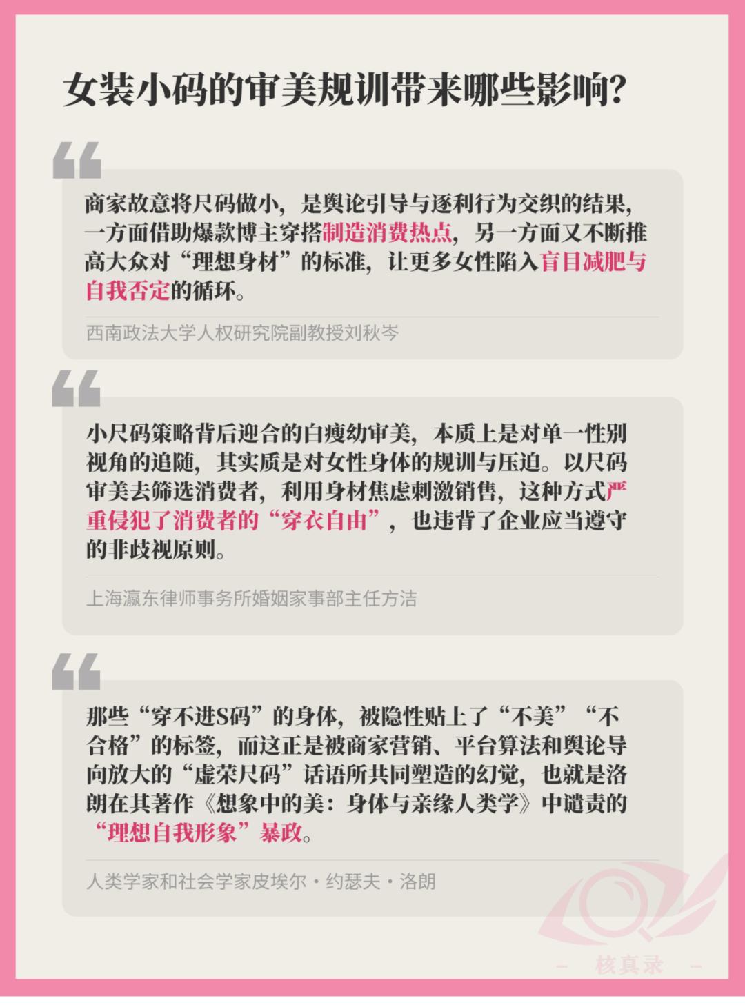 上海瀛东律师事务所婚姻家事部主任方洁也曾公开指出[8],小尺码策略背后迎合的“白瘦幼”审美,本质上是对单一性别视角的追随,其实质是对女性身体的规训与压迫。“以尺码审美去筛选消费者,利用身材焦虑刺激销售,这种方式严重侵犯了消费者的‘穿衣自由’,也违背了企业应当遵守的非歧视原则。”她强调。