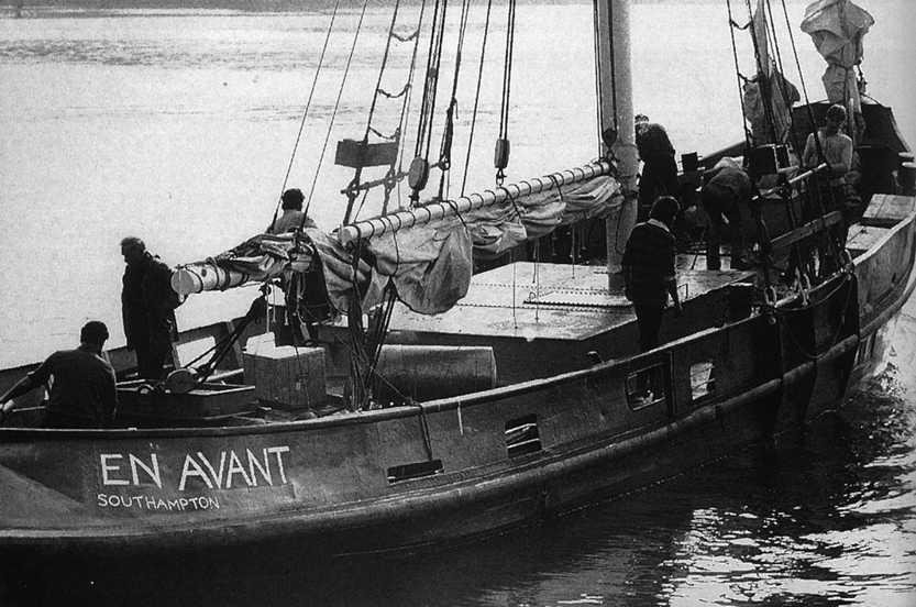 西蒙将传承蒂尔曼的火炬、完成他未竟梦想视为自己的使命:攀登史密斯岛上的福斯特山。他萌生了一个糟糕的主意:将曾是荷兰拖船的“飞跃”号(En Avant)改装成未来探险用的机帆船。他亲手为船安装了一台翻新的发动机,加装了一根钢制桅杆和横桁,并挂上了一套二手的纵帆索具。经过一番改造,“飞跃”号从远处看还真有几分帆船的样子——不过也仅限于“形似”罢了。由于没有压舱物和龙骨,这艘机帆船只要遇到一点海浪就会剧烈摇晃。低矮的后甲板简直就像一个晃来晃去的洗脚盆,海水不断从舷侧的排水孔涌入又流出。