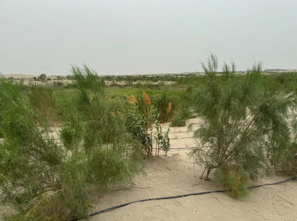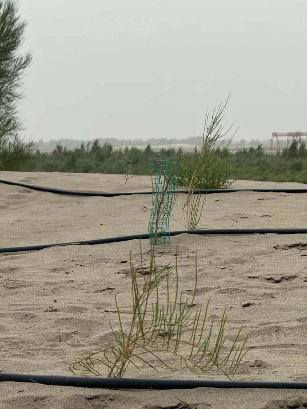 沙地里种植梭梭等固沙植物,搭配滴灌设施,推进荒漠化治理与植被恢复