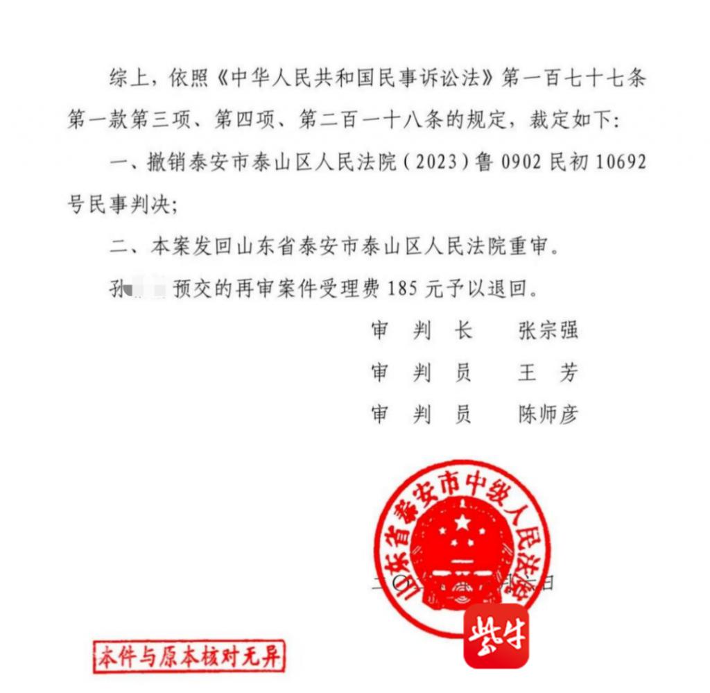 7 月 18 日,记者咨询了泰安市泰山区人民法院,工作人员回复称,本案属于发回重审案件,正处于审理阶段,目前还未出判决结果。