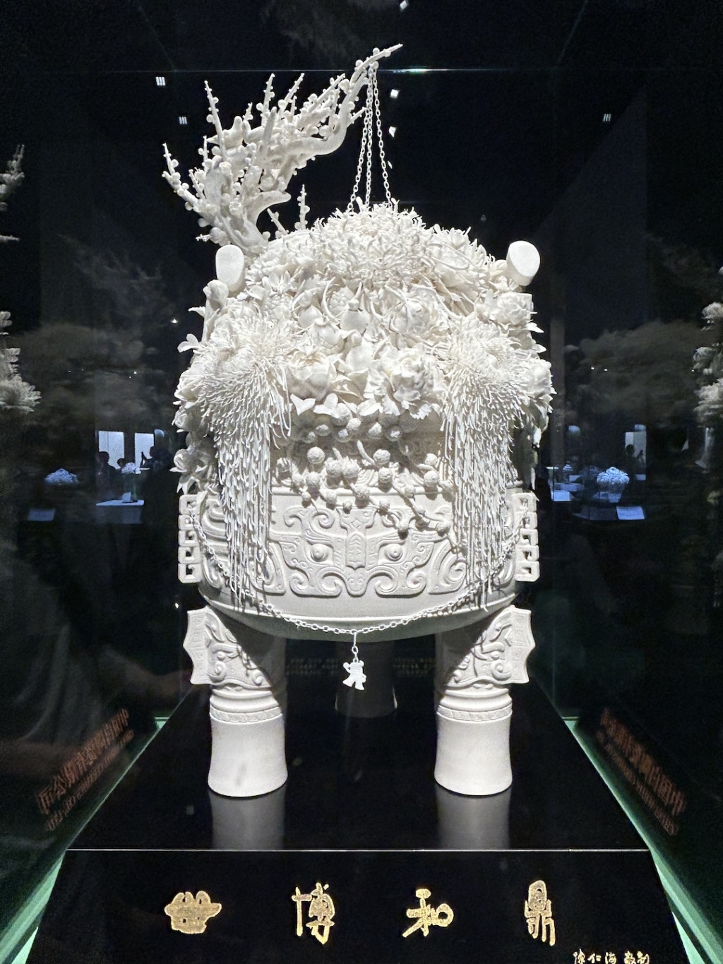 步入展厅迎面最中心的一件展品是福建省工艺美术大师陈仁海的作品——《世博和鼎》。15年前,它曾作为上海世博会的重要见证在上海亮相,承载着对世博盛会的美好愿景,时隔15载,这一有着重要纪念意义的作品重归浦江展出。这件高129厘米、直径72厘米的瓷鼎,作品灵感源自中国“铸鼎以纪盛世”的传统,同时将世博会“城市,让生活更美好”的主题与中国“和而不同”的文化精髓结合。